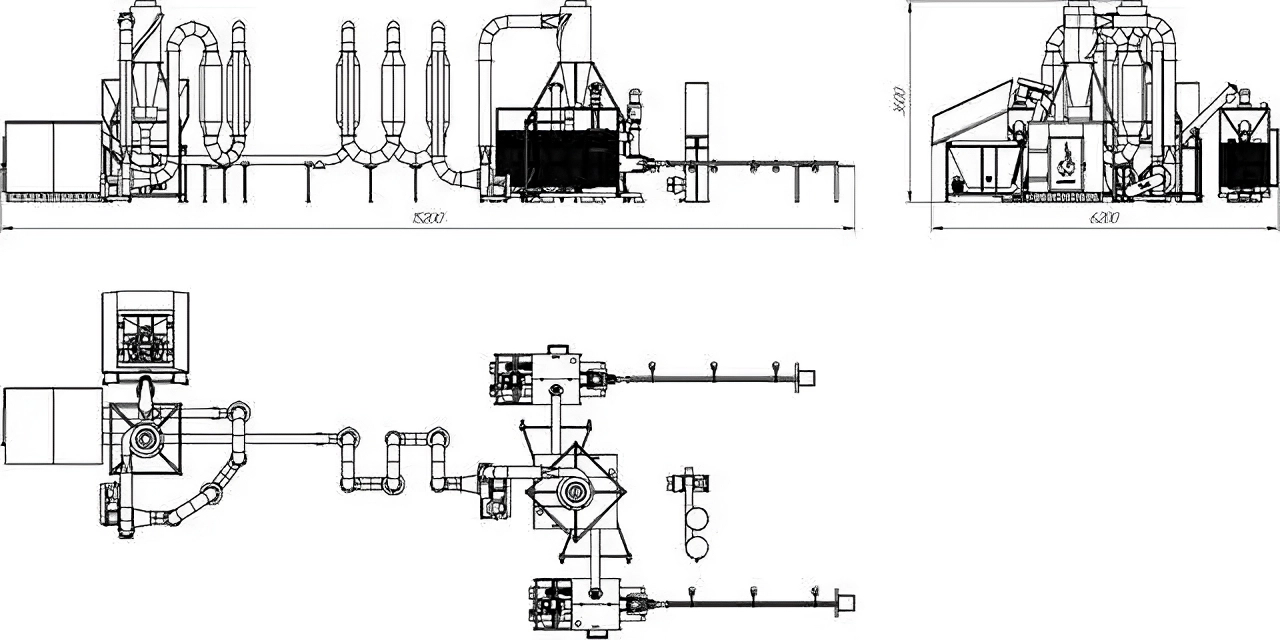 Vyčištěná surovina je přenesena do sušicího systému SA-800, kde je biomasa aerodynamicky sušena vzduchem ohřátým šamotovou pecí.