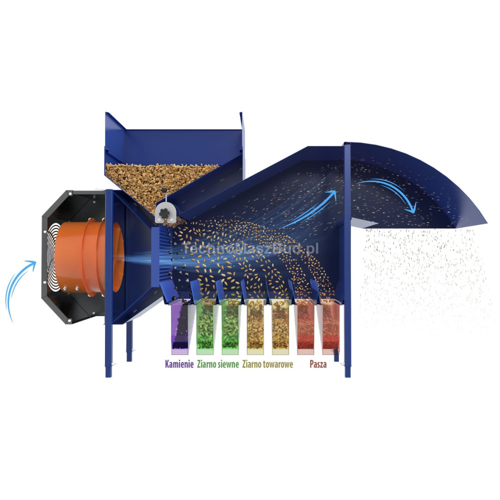 Jednoduchá a funkční konstrukce separátoru je založena na síle proudícího vzduchu. Zrno, které je nasypáno do násypky, je rovnoměrně rozprostřeno a dostává se do separační komory. Tam silný proud vzduchu odděluje těžké nečistoty a kameny, které jsou směrovány do samostatné frakce. Vyčištěné zrno putuje dále, zatímco lehoučké nečistoty, poškozená a polámaná zrna a prach jsou vyfoukávány ven.