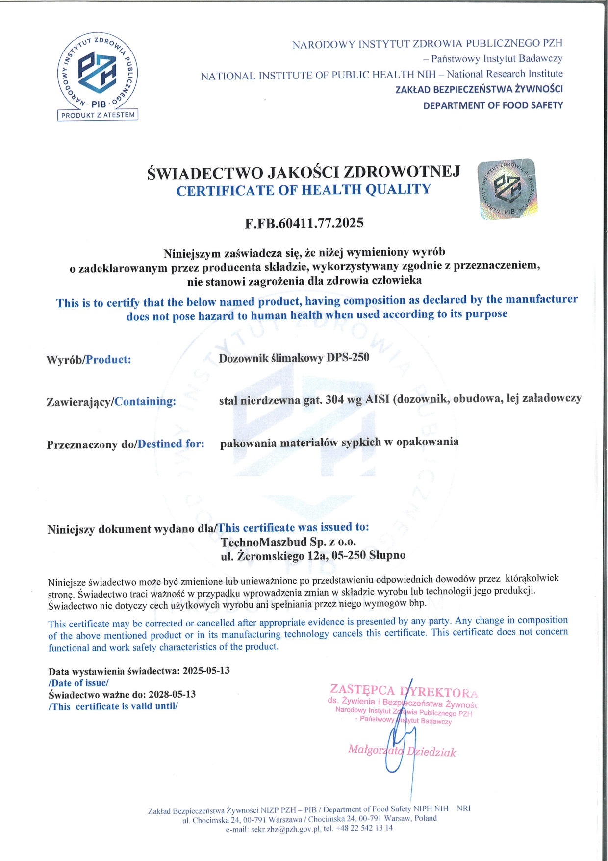 Dozownik ślimakowy DPS-250 to wydajne i wszechstronne urządzenie do precyzyjnego dozowania materiałów sypkich, idealne do pracy w zakładach produkcyjnych, przemyśle spożywczym, chemicznym i budowlanym. Może pełnić funkcję zarówno jako dozownica do pakowania materiałów sypkich, jak i jako dozownica do pakowania mąki i cukru, oferując elastyczność w zależności od potrzeb produkcyjnych. Wszystkie elementy robocze urządzenia mają kontakt z surowcem wyłącznie poprzez stal nierdzewną, co czyni ten dozownik całkowicie bezpiecznym dla zdrowia. Potwierdza to świadectwo PZH, które potwierdza brak zagrożenia dla użytkownika i konsumenta.
