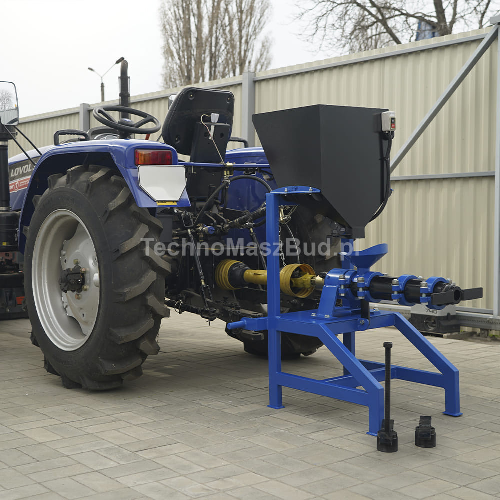 EGK-350 on PTO is a high-performance grain extruder designed for intensive thermo-mechanical processing of grains and cereals using hot extrusion. The drive from a tractor via the power take-off shaft (PTO) ensures complete independence from the electrical installation and allows operation directly on the farm or in field conditions. This solution is dedicated to users who expect high throughput and stable feed quality.