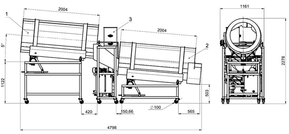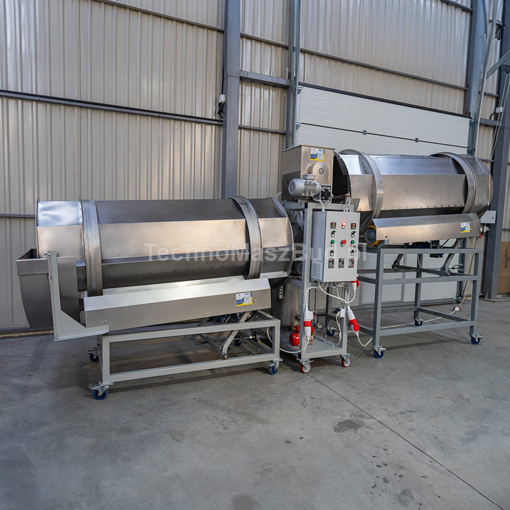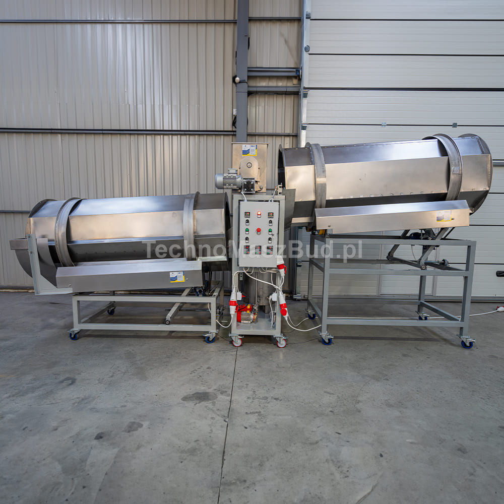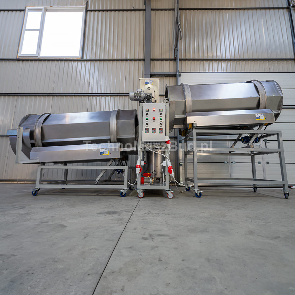 - Tamburo n. 2 – grazie alla costruzione speciale e alla geometria del tamburo, garantisce una miscelazione delicata, uniforme e di alta qualità degli additivi secchi con il prodotto. L’umidificazione precedente migliora l’adesione. Regolazione della velocità, dell’angolo di inclinazione e il grande diametro del tamburo consentono di scegliere in modo ottimale le modalità di miscelazione e scarico del prodotto.