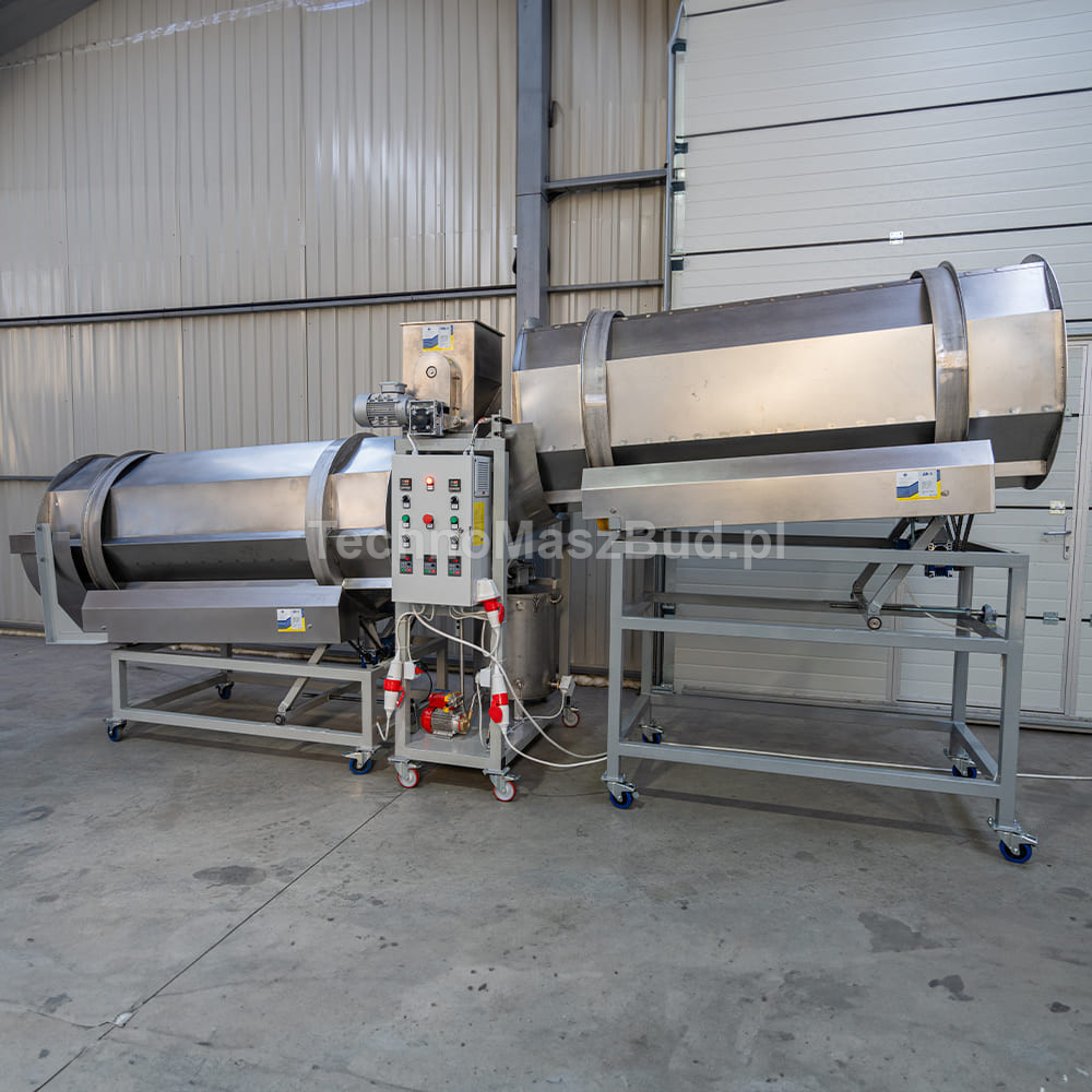 - Tamburo n. 1 – qui vengono introdotti ingredienti liquidi, come olio o grasso. Grazie alla velocità regolabile del tamburo, la possibilità di impostare l’angolo di inclinazione e il dosaggio programmato del liquido, il prodotto viene rivestito in modo uniforme dagli additivi. Questo permette di mantenere la ricetta e garantisce una migliore adesione degli ingredienti secchi nella fase successiva.