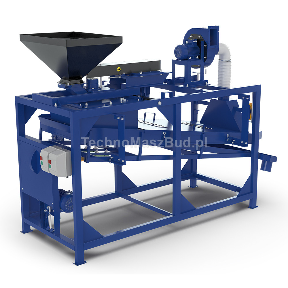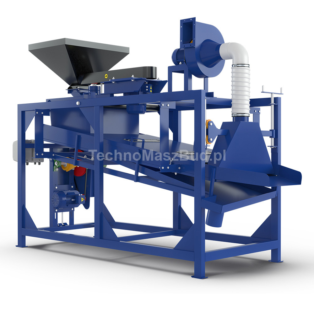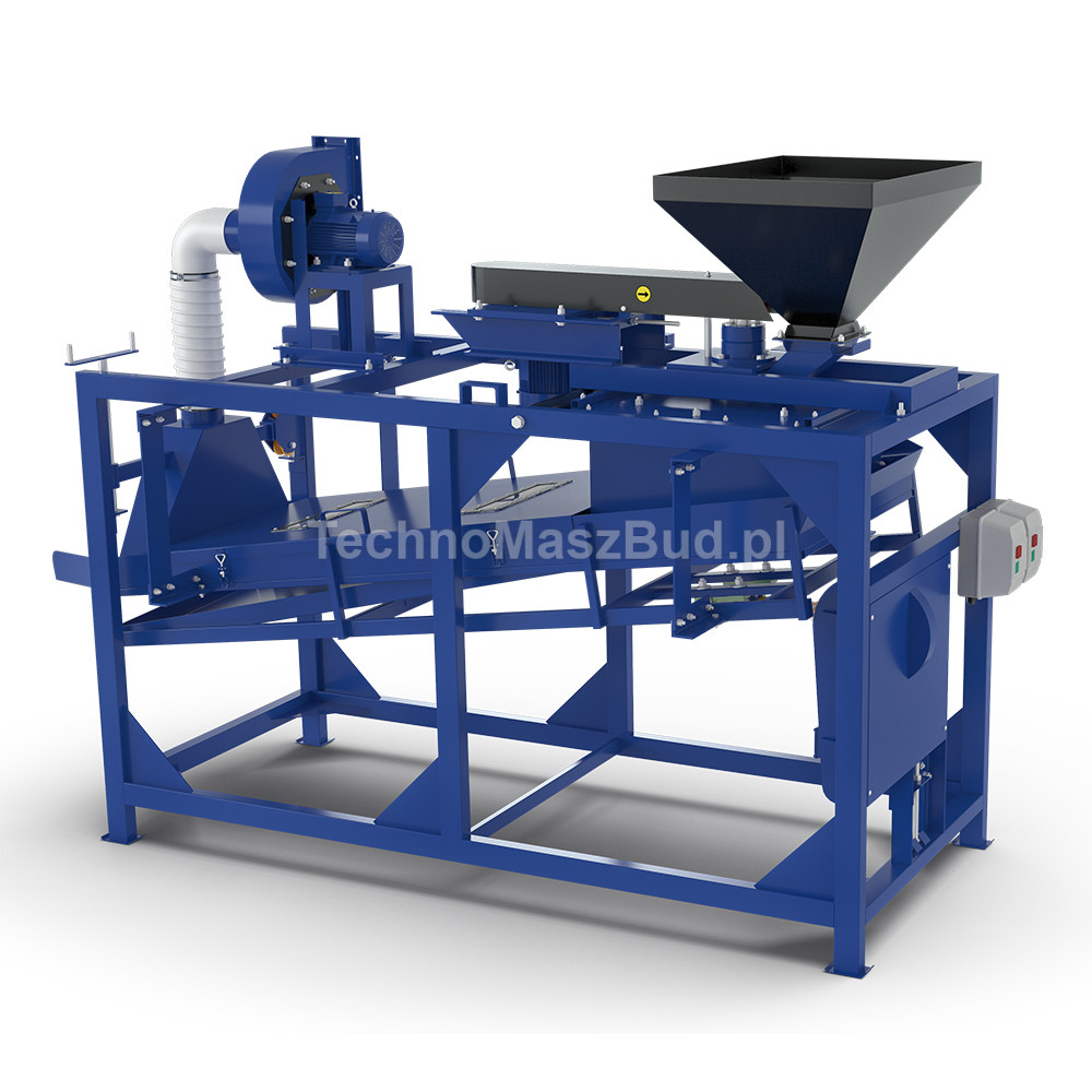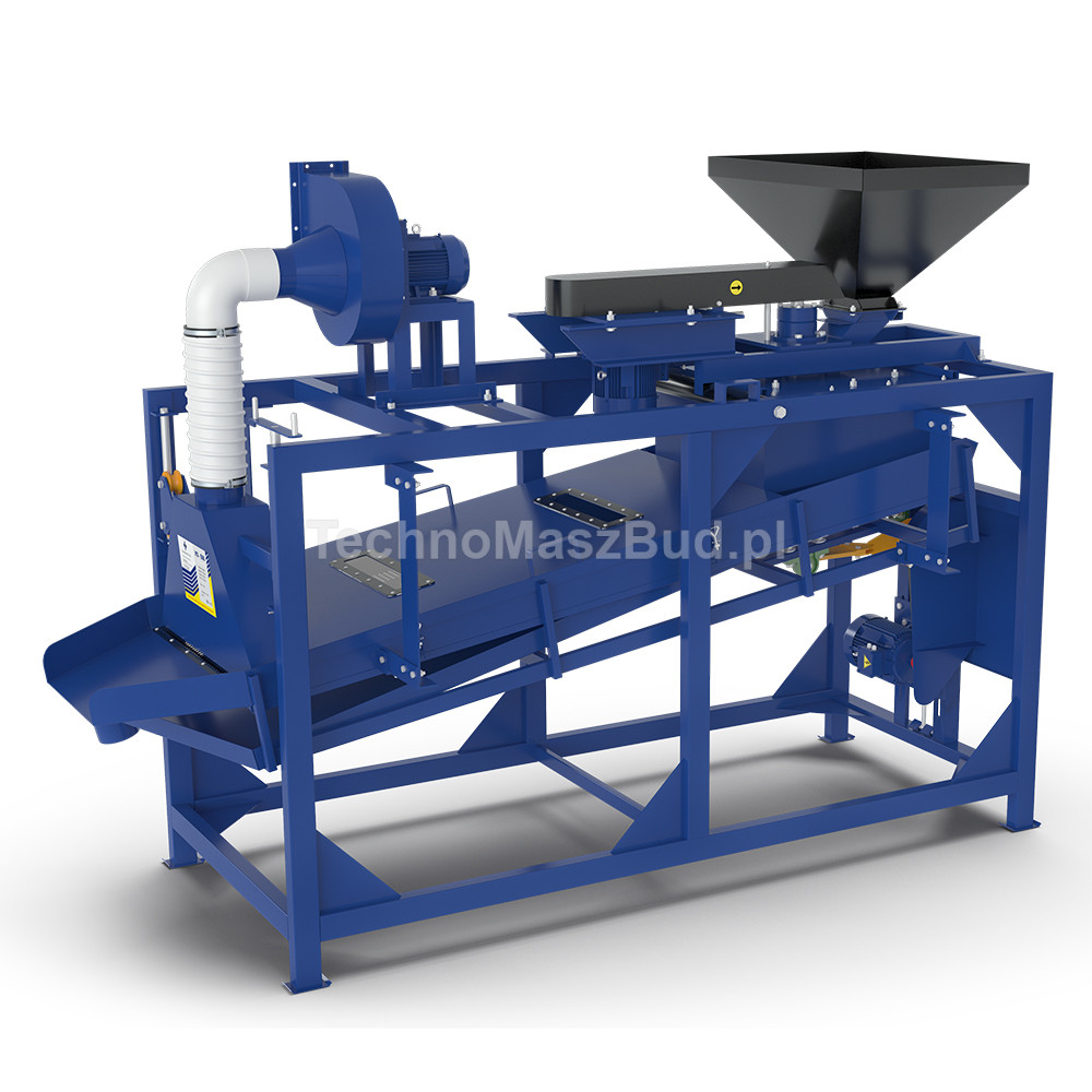 The operating principle of the device is based on breaking the hard seed hull by striking it against an inclined, hard working surface (deck). The material is then separated into fractions using a set of screens operating in a reciprocating motion.