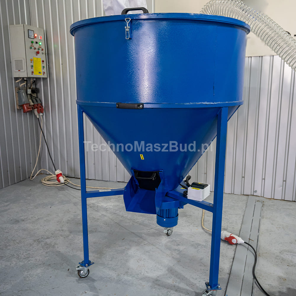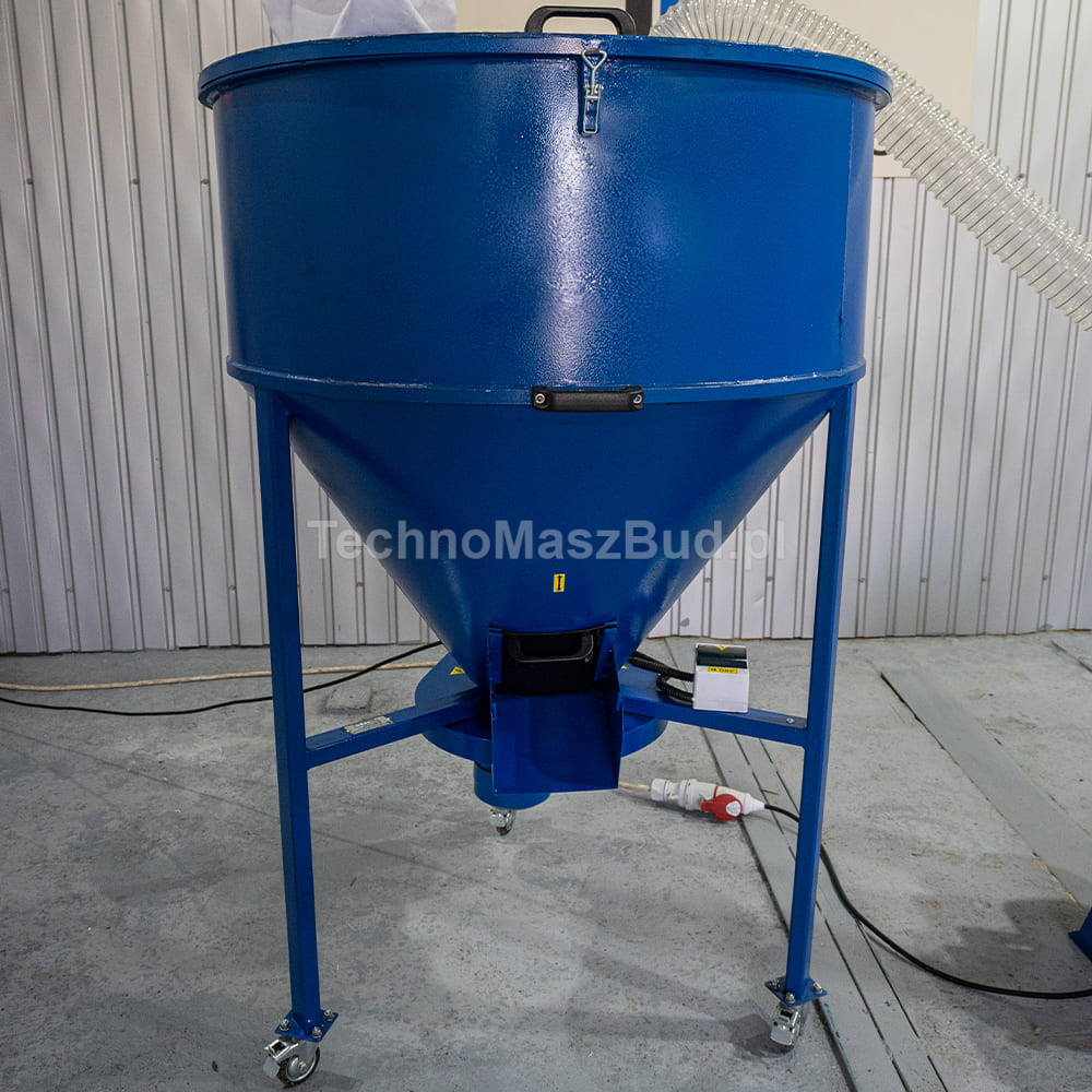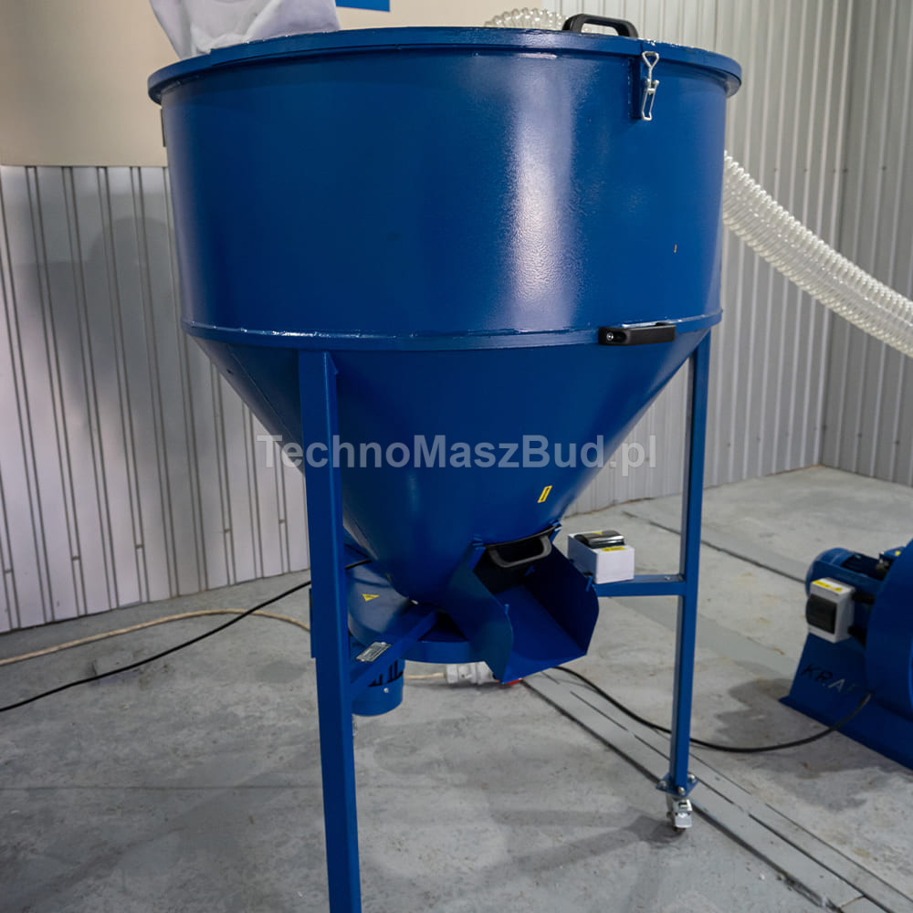 MP-300 è realizzato in acciaio strutturale e dotato di un meccanismo a coclea verticale. Questo assicura un movimento continuo della materia prima dal basso verso l’alto, garantendo una miscelazione uniforme del mangime. Il miscelatore è adattato all'alimentazione pneumatica delle materie prime, il che rende il lavoro molto più efficiente.