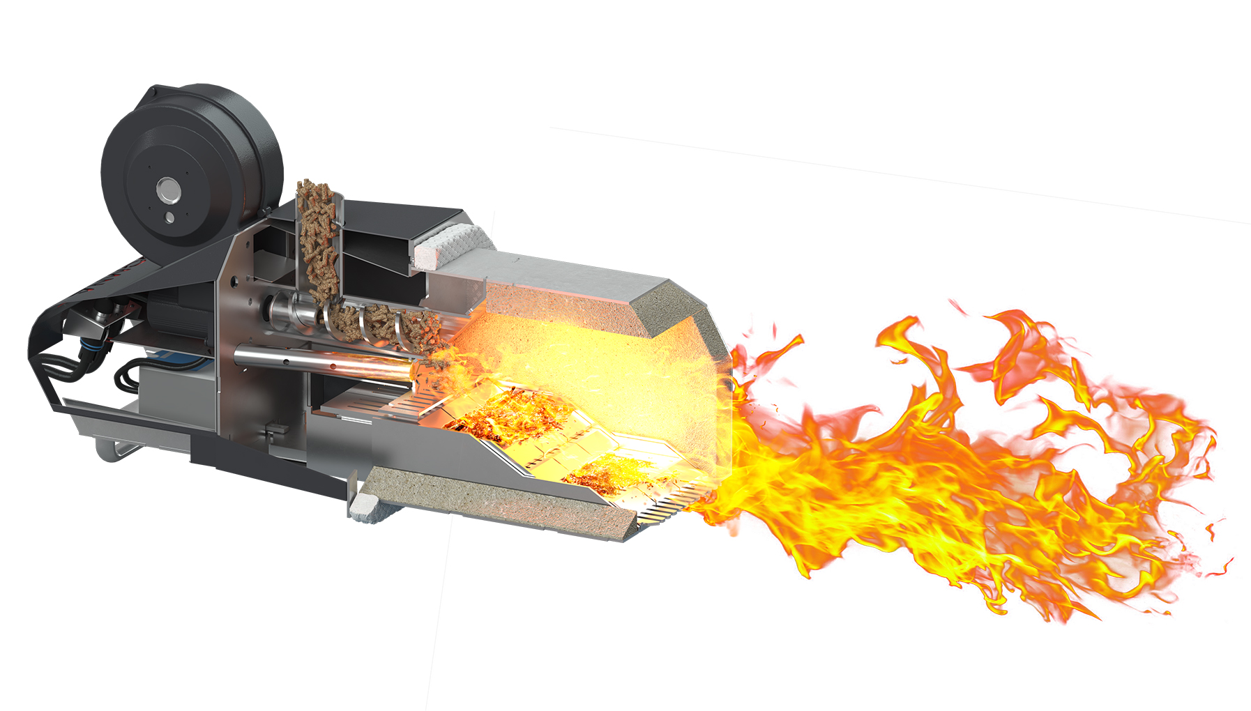 Pellet transportowany jest do palnika poprzez podajnik ślimakowy, gdzie zostaje spalony na specjalnym ruszcie. Wentylator nadmuchowy dostarcza odpowiednią ilość powietrza, zapewniając optymalne warunki spalania. Ciepło generowane w palniku przekazywane jest do kotła, który ogrzewa wodę w instalacji grzewczej. Za cały proces odpowiada sterownik PLUM, kontrolujący temperaturę, dopływ pelletu i powietrza.