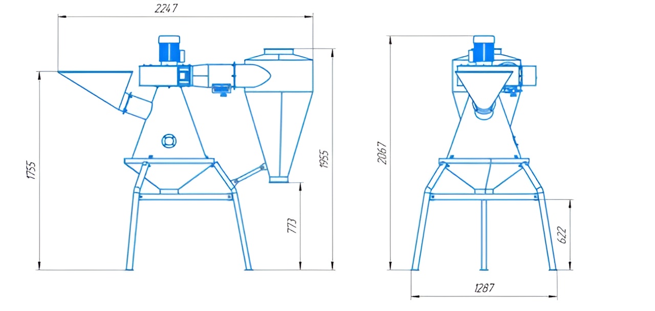 SZ-1 Grain Air Separator is a modern device designed for the effective removal of light impurities from grain materials. It operates on the principle of aerodynamic separation, where fractions with different terminal velocities are separated by an air stream.